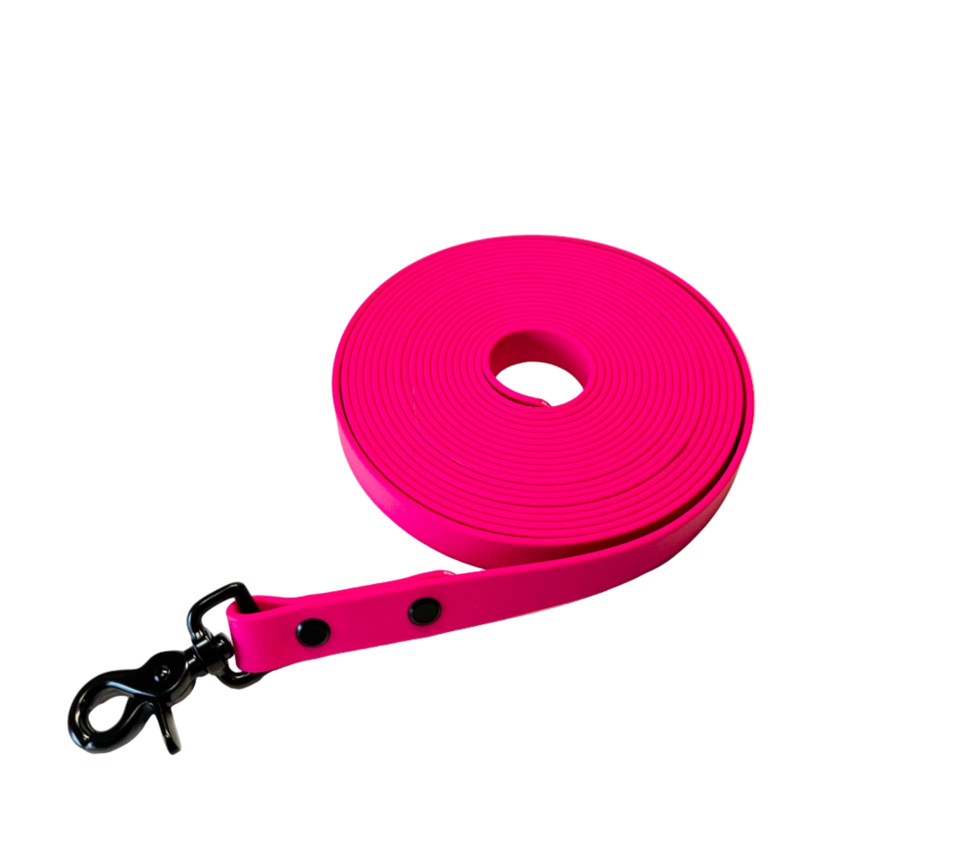 Give your dog freedom while keeping control. This long line leash is perfect for recall training, scent work, or open space adventures. Built from BioThane with reinforced Chicago screws and a D-ring for accessories.