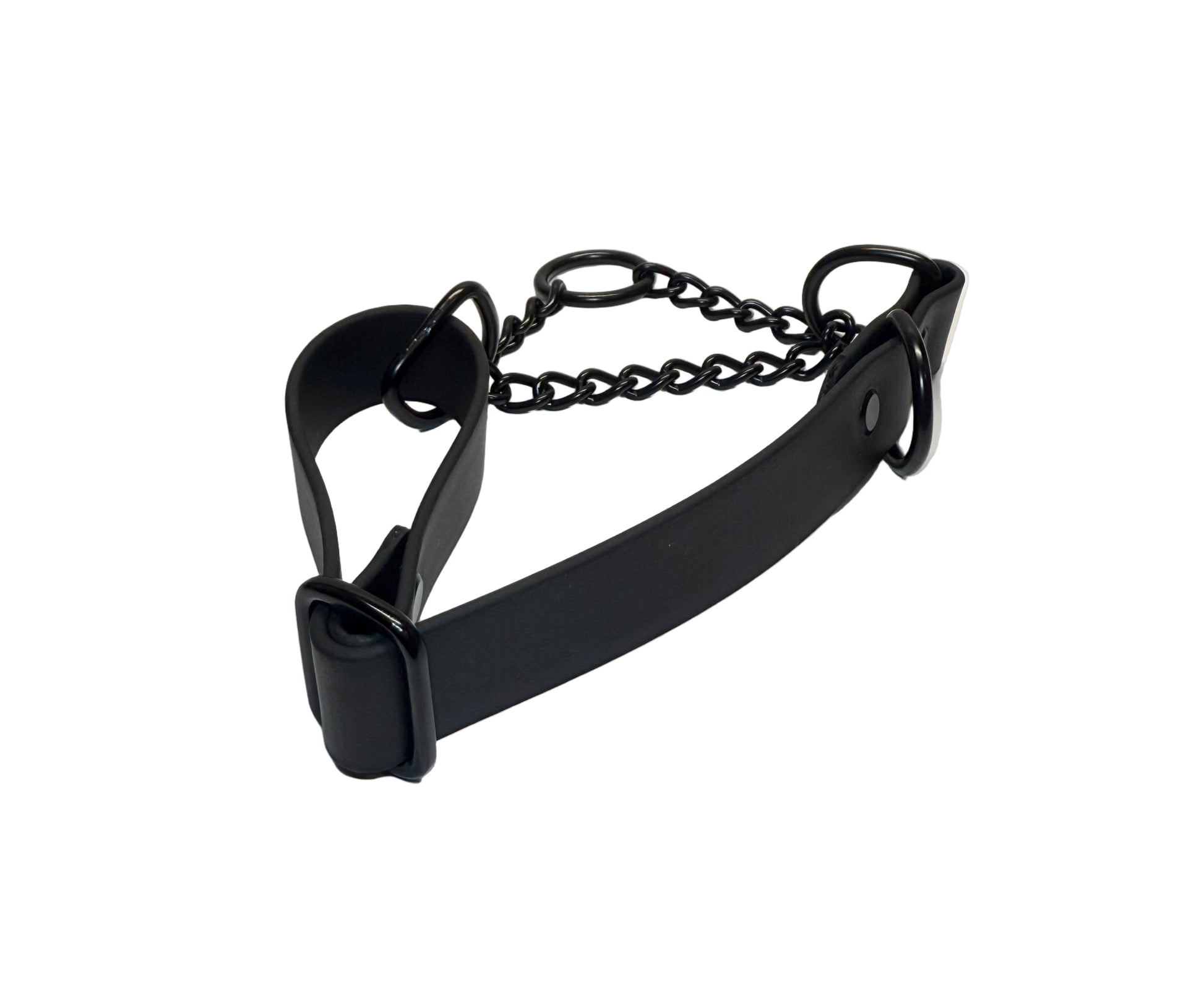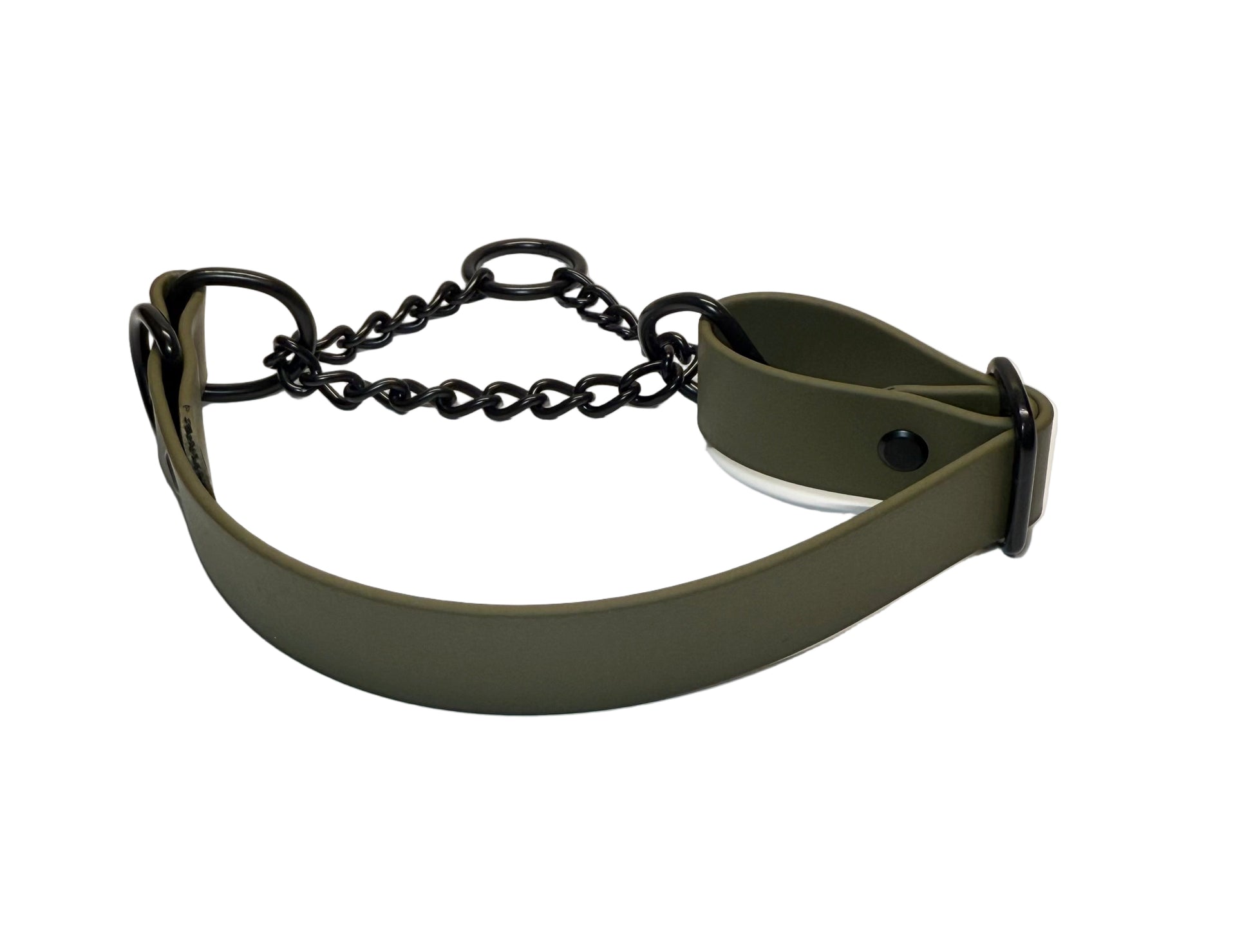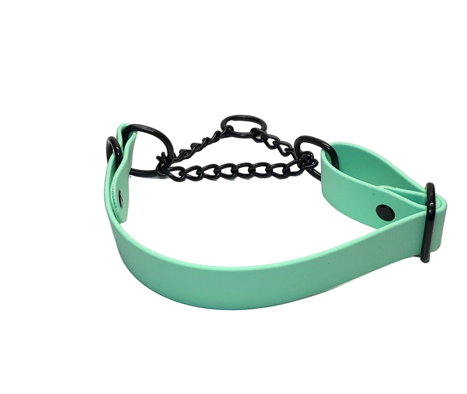 An adjustable BioThane Martingale collar with a stainless steel chain for gentle, controlled correction. Finished with convenient D-ring and reinforced Chicago screws for durability and strength.