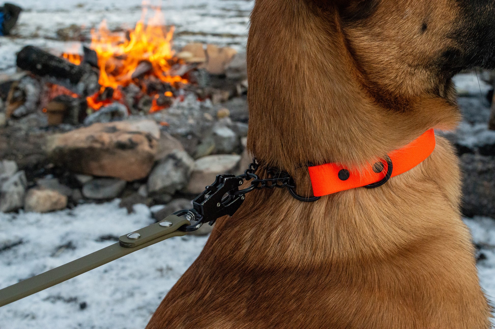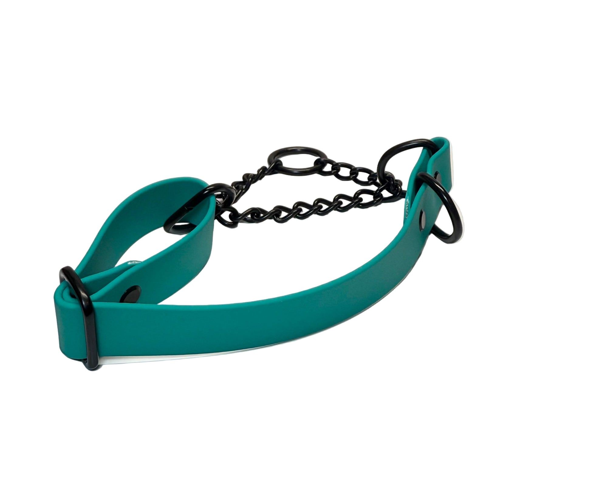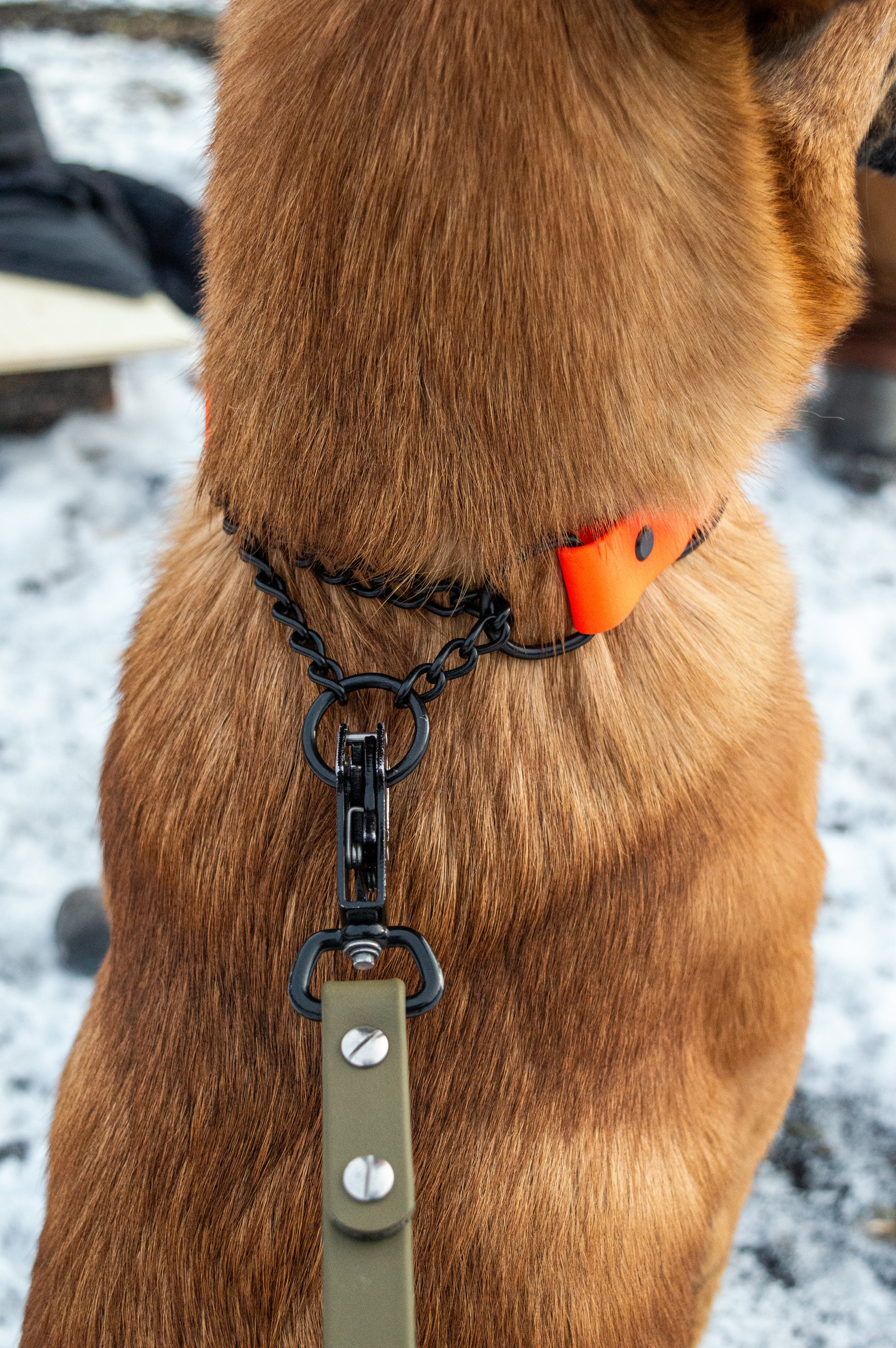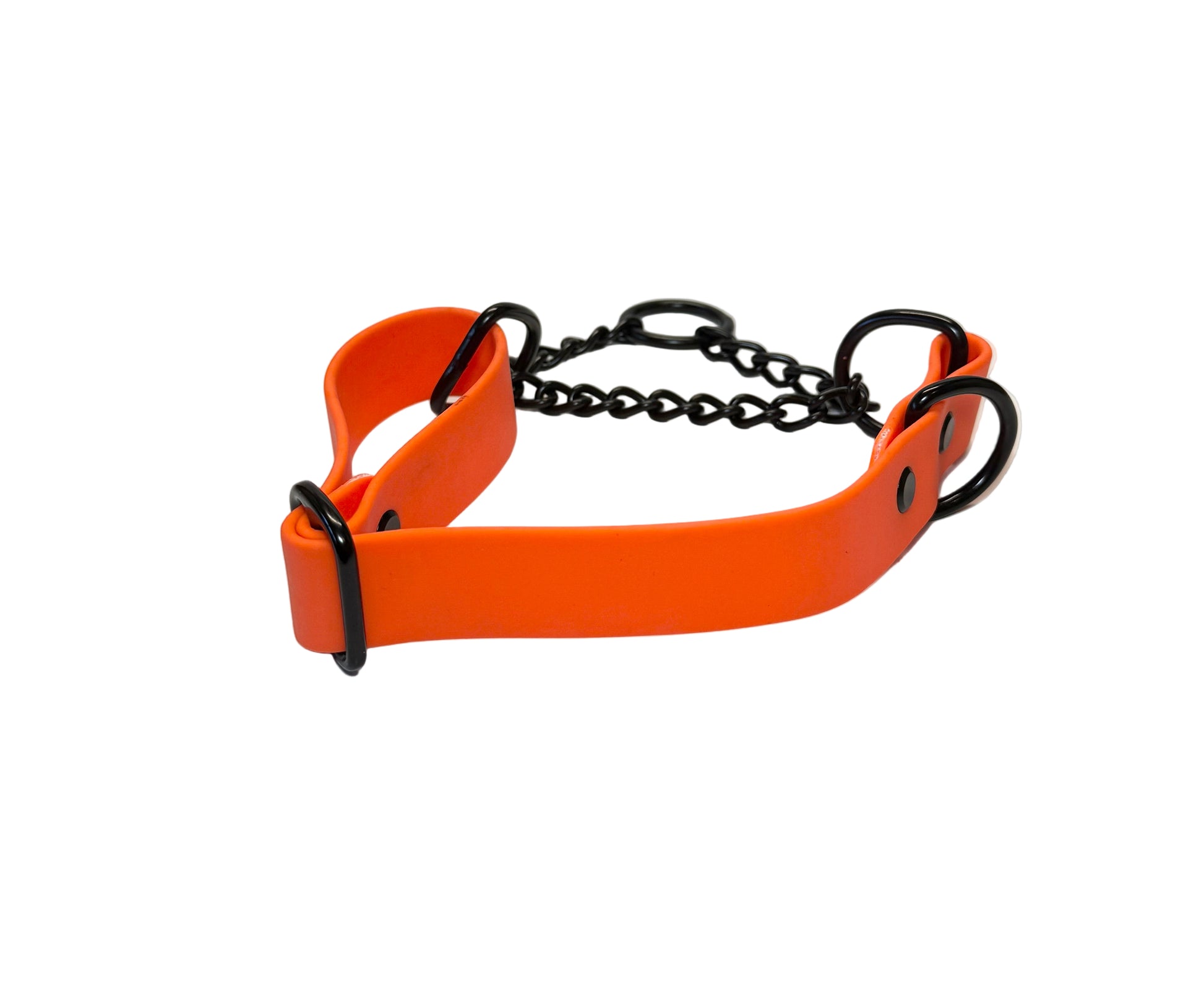 An adjustable BioThane Martingale collar with a stainless steel chain for gentle, controlled correction. Finished with convenient D-ring and reinforced Chicago screws for durability and strength.