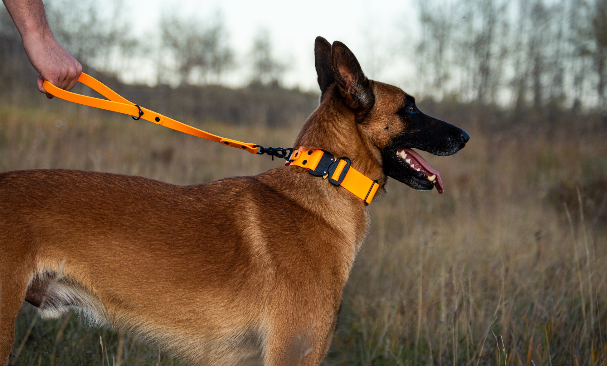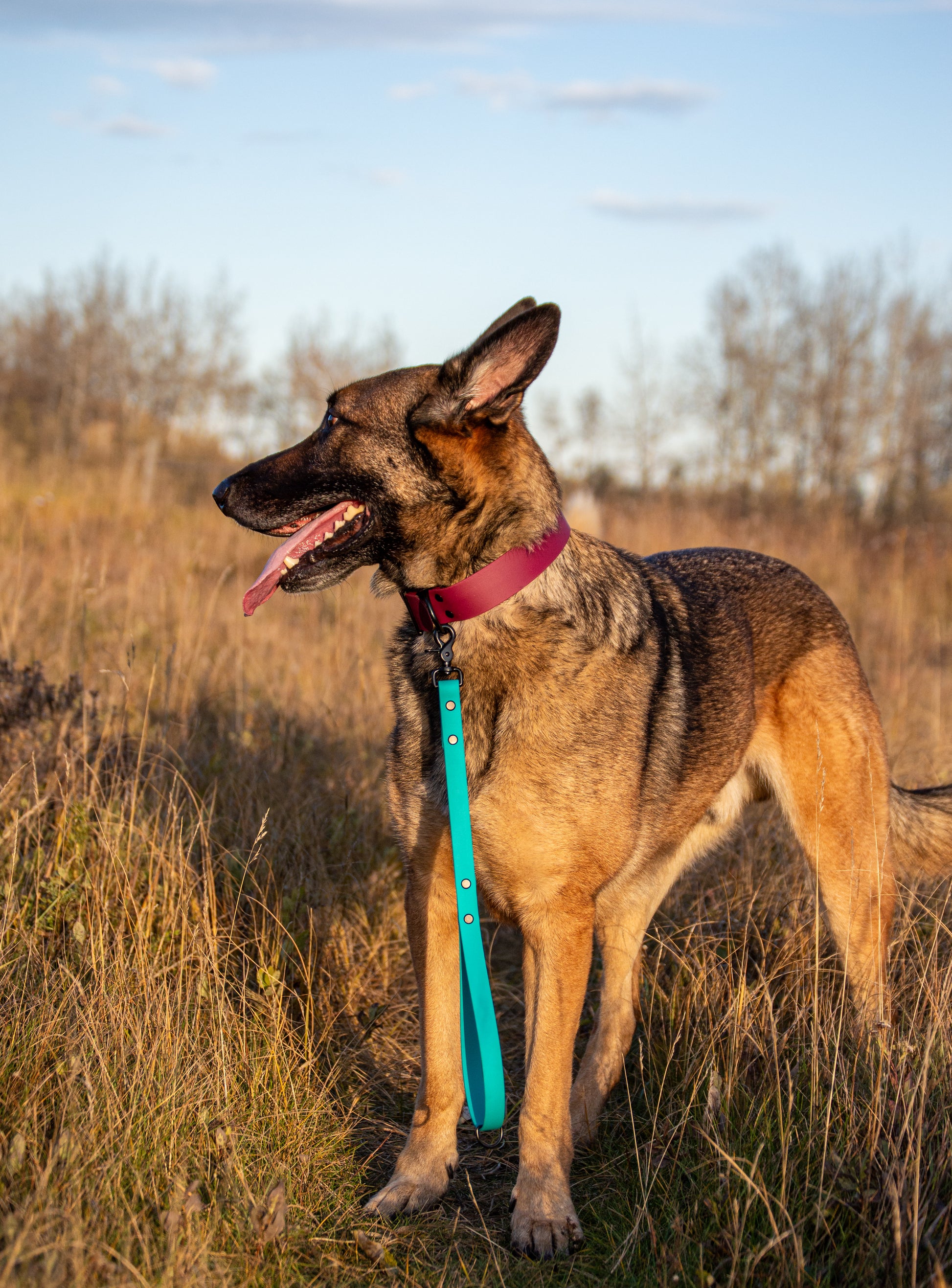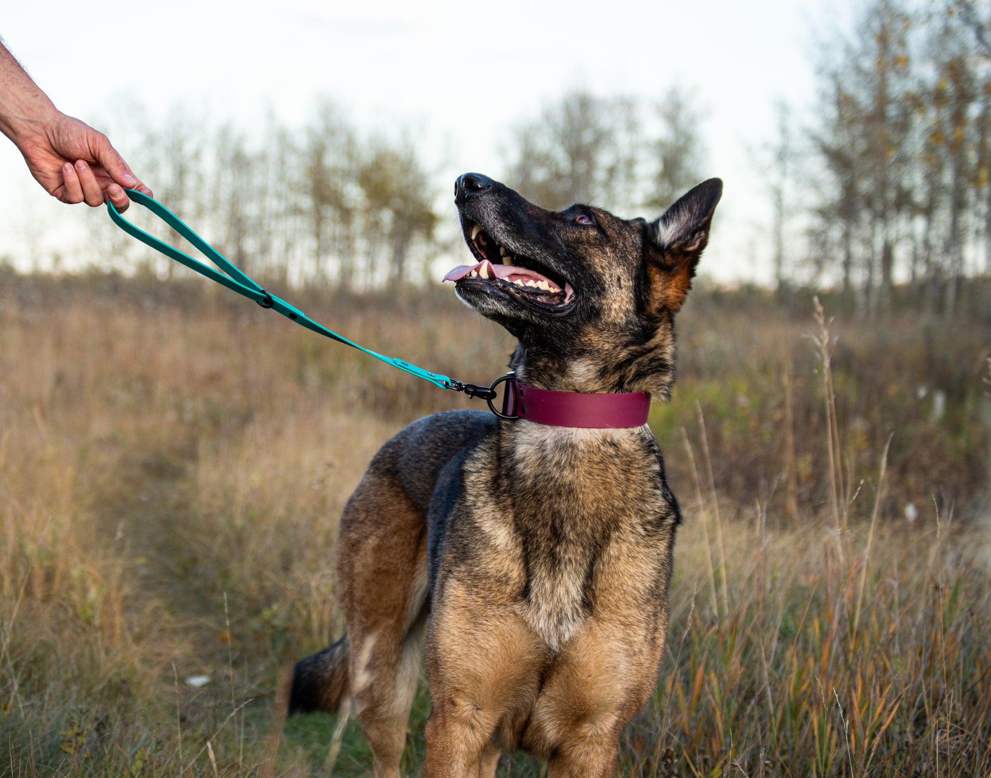 Compact and strong, this traffic handle dog leash is perfect for crowded spaces or close control. Made from waterproof BioThane with reinforced Chicago screws and a handy D-ring for accessories.